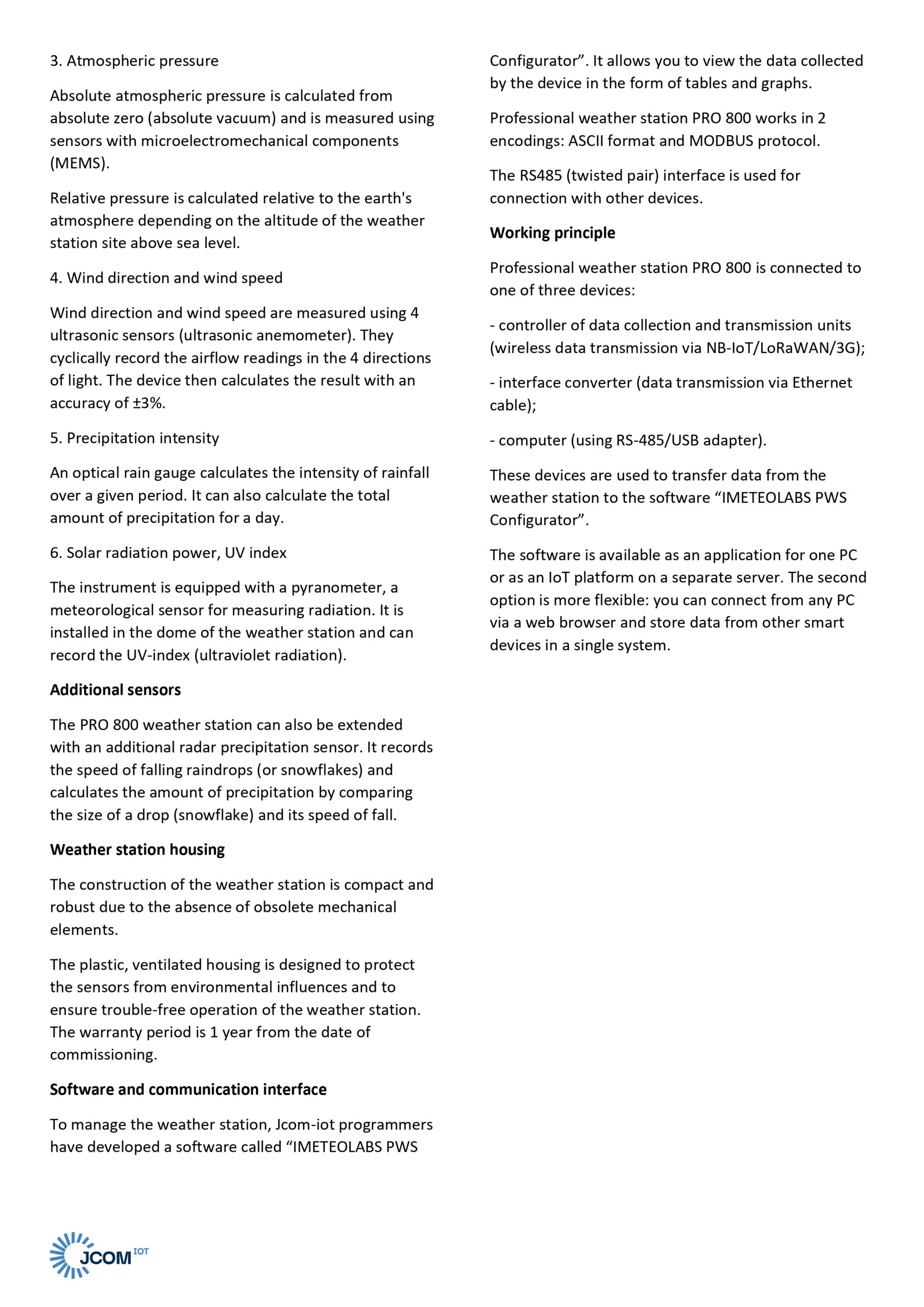 PRO 800 weather station works in 2 encodings: ASCII format and MODBUS protocol.