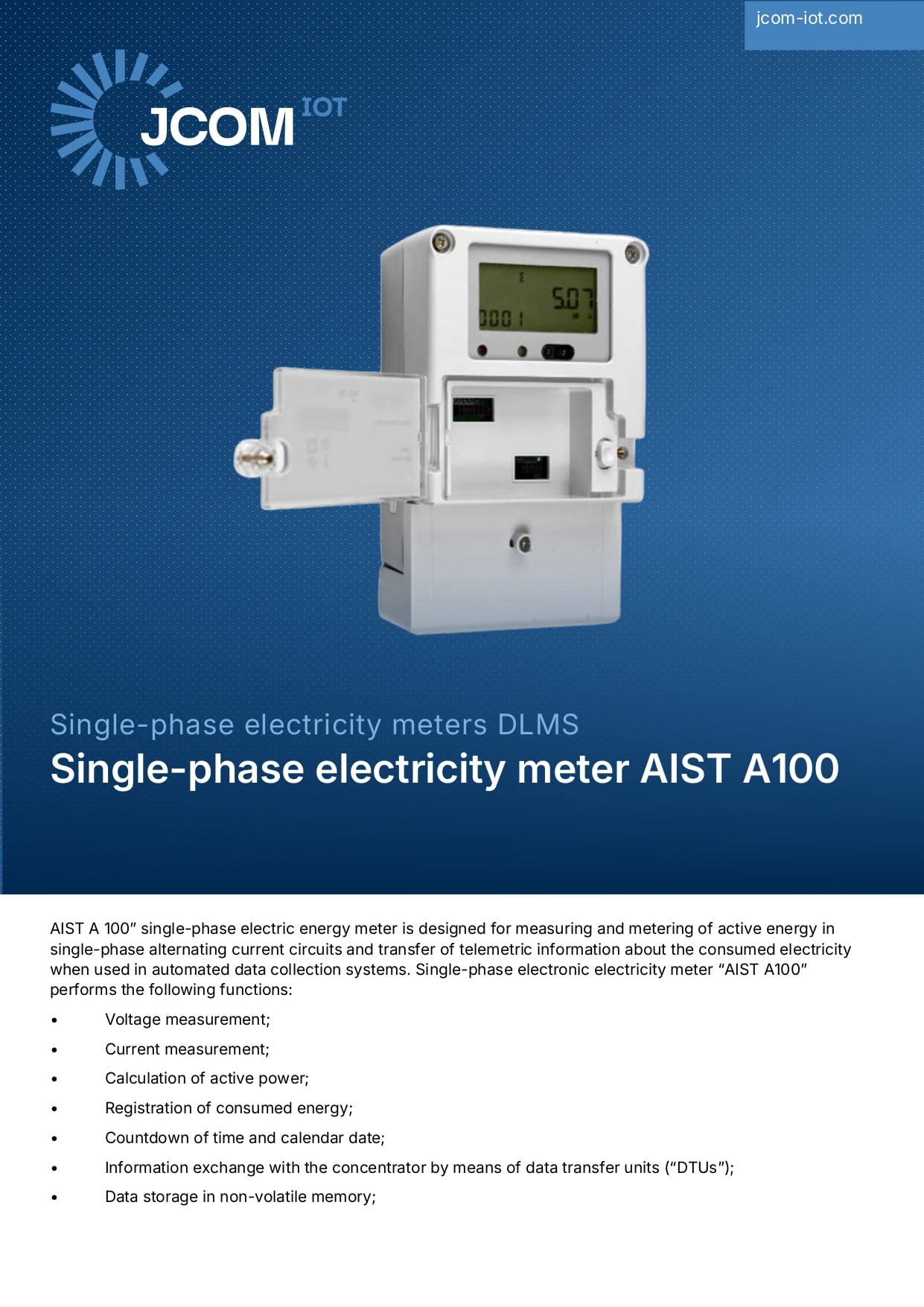 AIST A 100” single-phase electric energy meter is designed for measuring and metering of active energy in single-phase alternating current circuits and transfer of telemetric information about the consumed electricity when used in automated data collection systems. Single-phase electronic electricity meter “AIST A100” performs the following functions:
