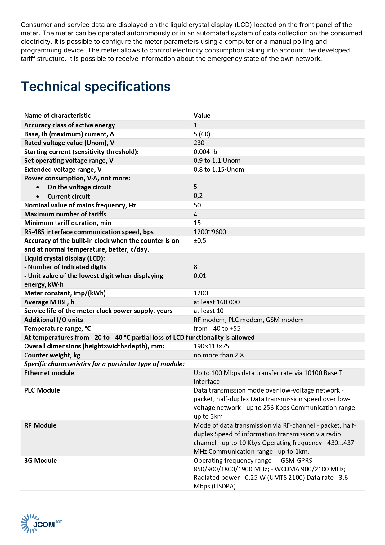 Consumer and service data are displayed on the liquid crystal display (LCD) located on the front panel of the meter. The meter can be operated autonomously or in an automated system of data collection on the consumed electricity. It is possible to configure the meter parameters using a computer or a manual polling and programming device. The meter allows to control electricity consumption taking into account the developed tariff structure. It is possible to receive information about the emergency state of the own network.