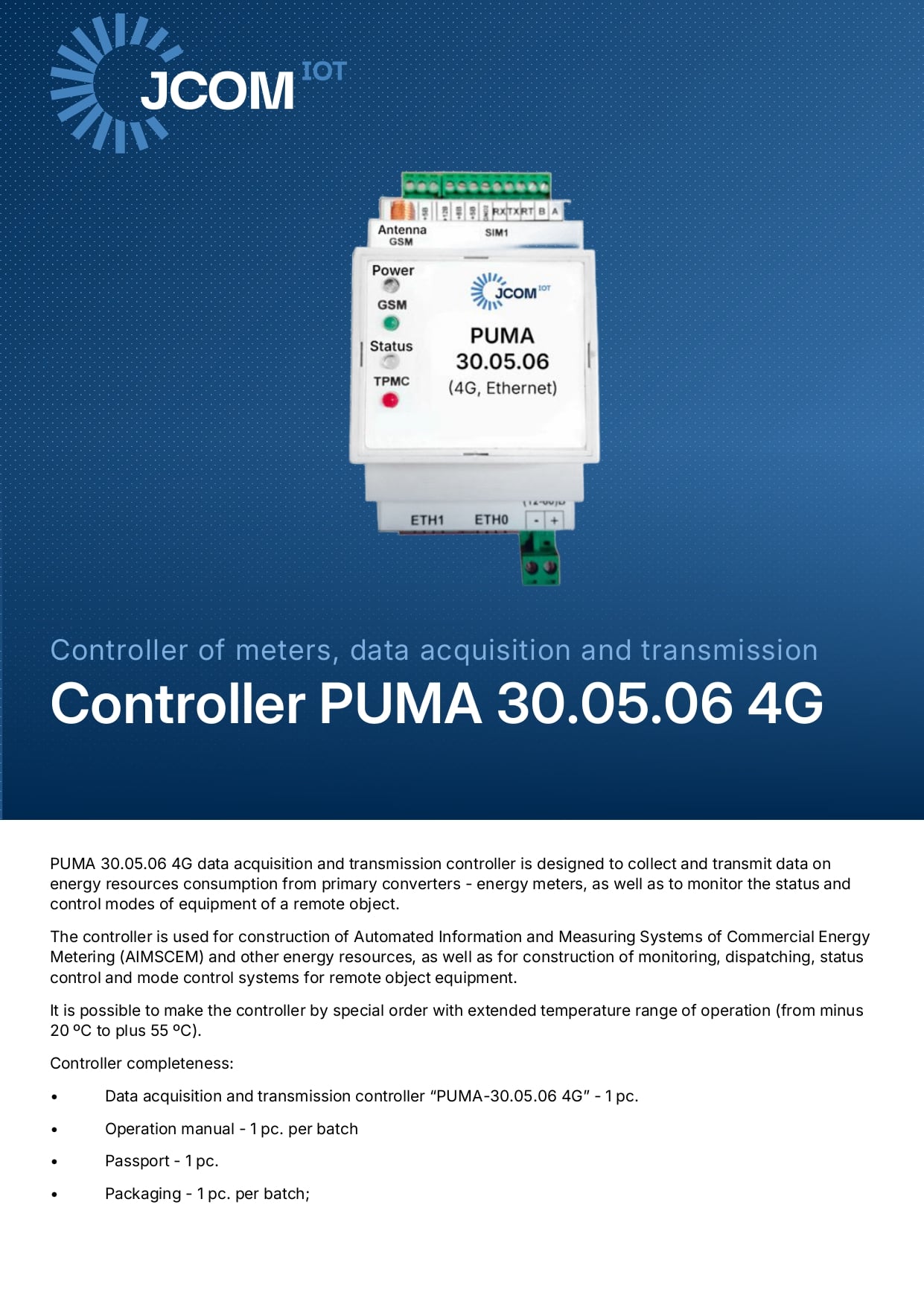 PUMA 30.05.06 4G data acquisition and transmission controller is designed to collect and transmit data on energy resources consumption from primary converters – energy meters, as well as to monitor the status and control modes of equipment of a remote object.