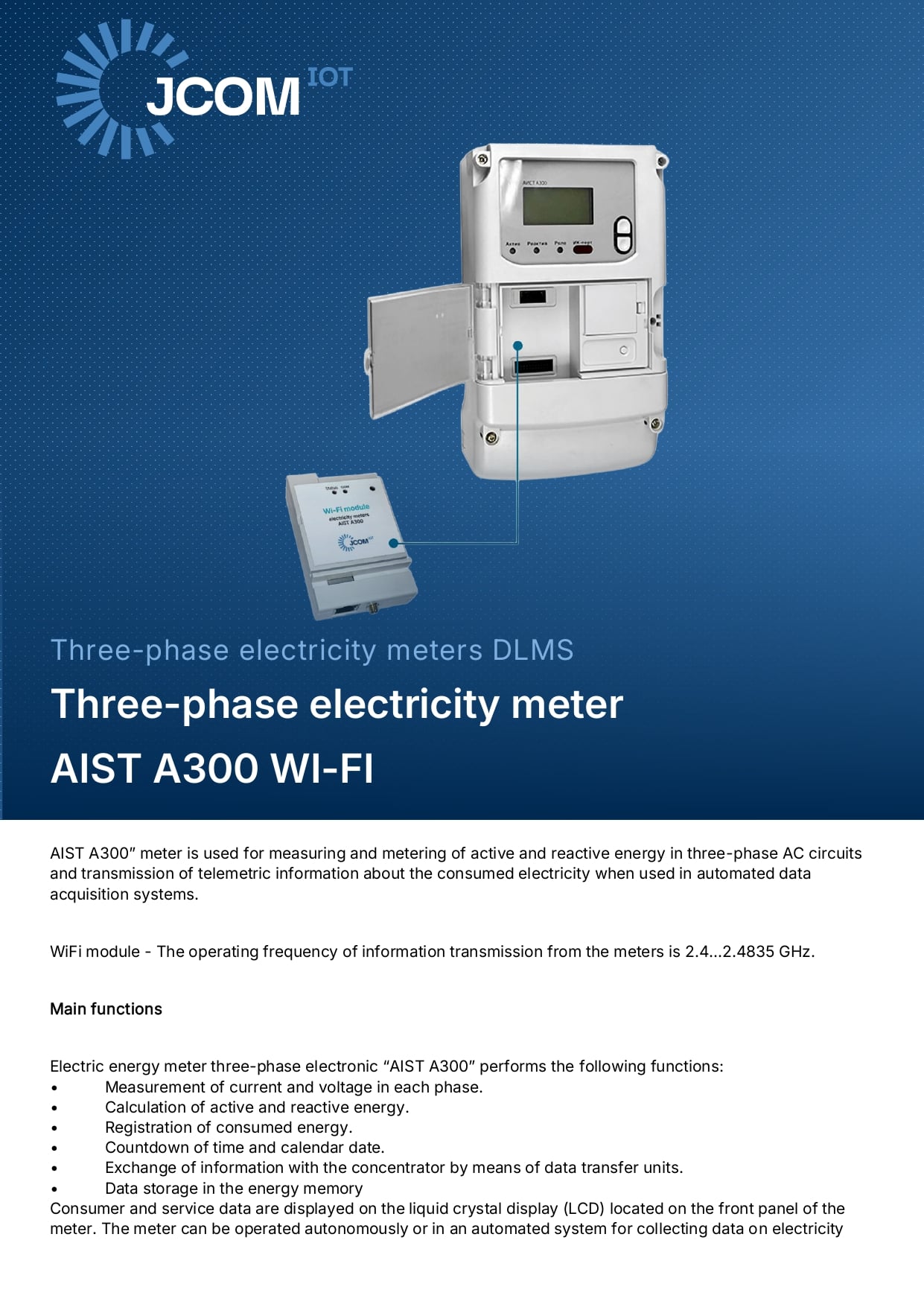 AIST A300” meter is used for measuring and metering of active and reactive energy in three-phase AC circuits and transmission of telemetric information about the consumed electricity when used in automated data acquisition systems.